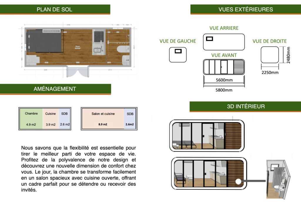 Le VEDETTE 500 est un modèle plus spacieux qui allie élégance et fonctionnalité. Avec sa chambre, sa salle de bain et sa cuisine intégrée, il offre tout le confort nécessaire pour des séjours prolongés. Ce modèle est conçu pour ceux qui recherchent une véritable expérience d’habitat combinant praticité et modernité.